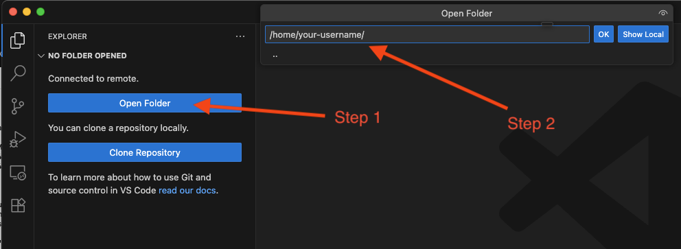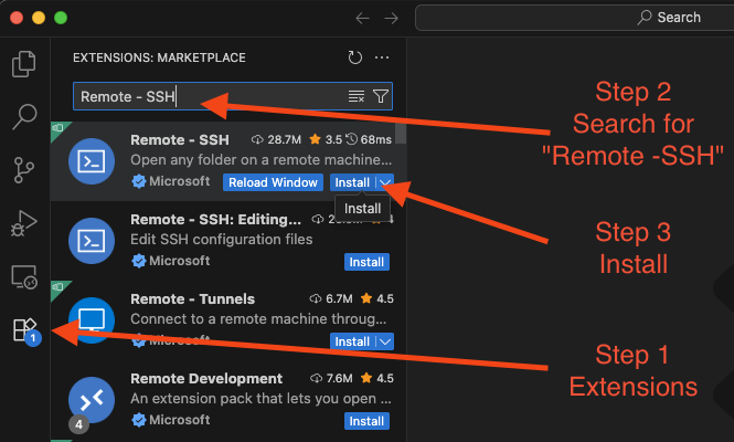 Click on the Extensions icon, seach for Remote - SSH and install the extension.
