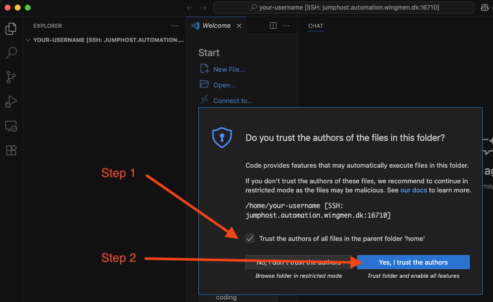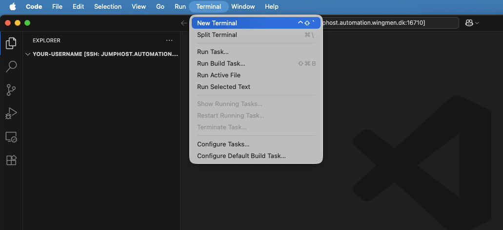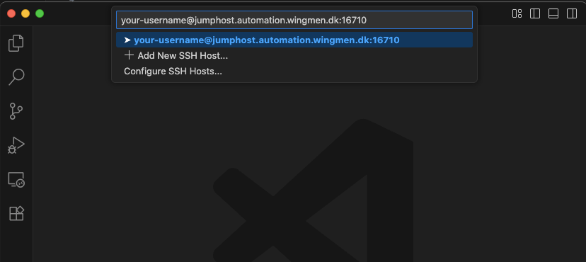 Enter your username, the hostname and custom port like this: your-username@jumphost.automation.wingmen.dk:16710